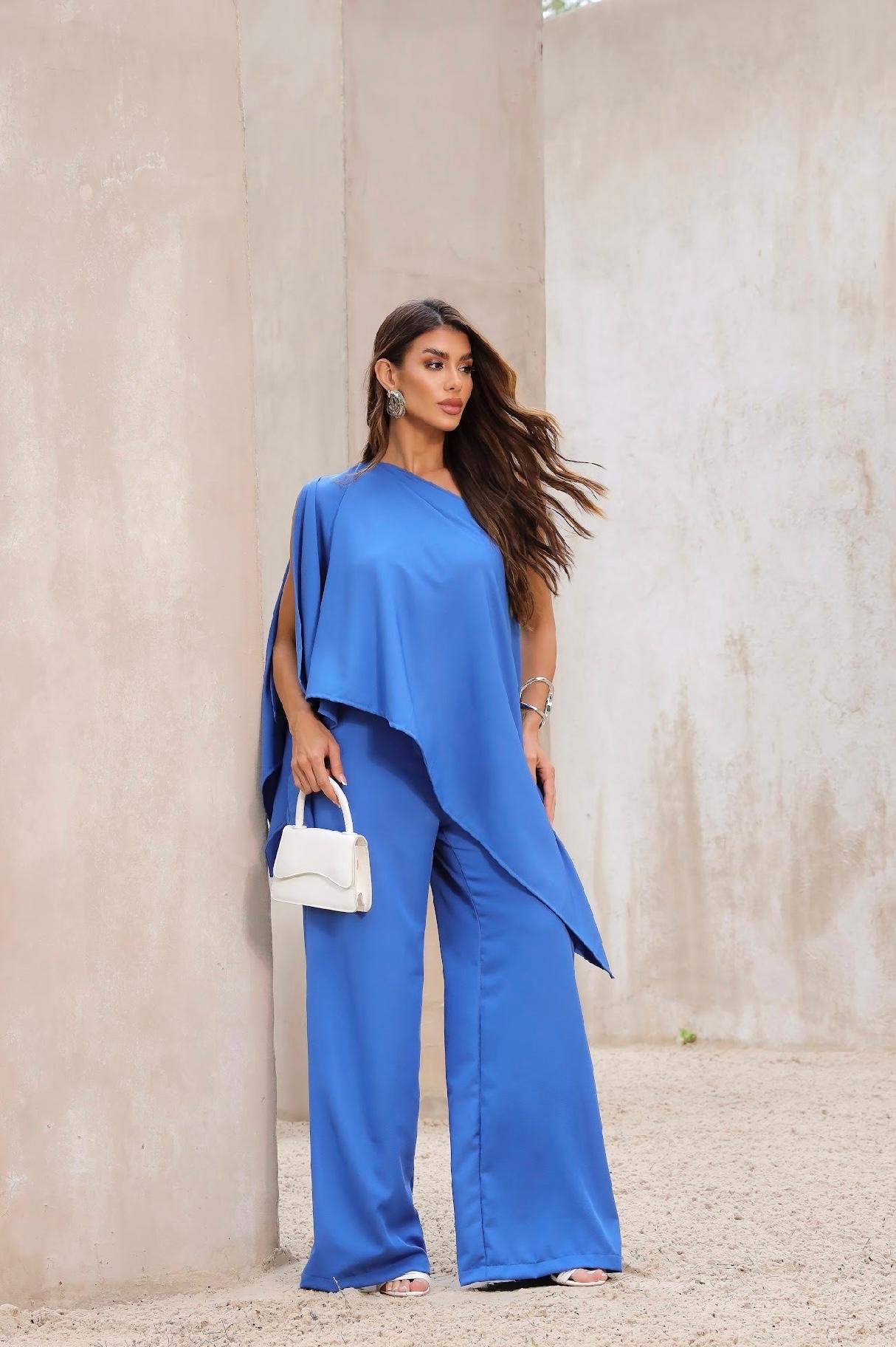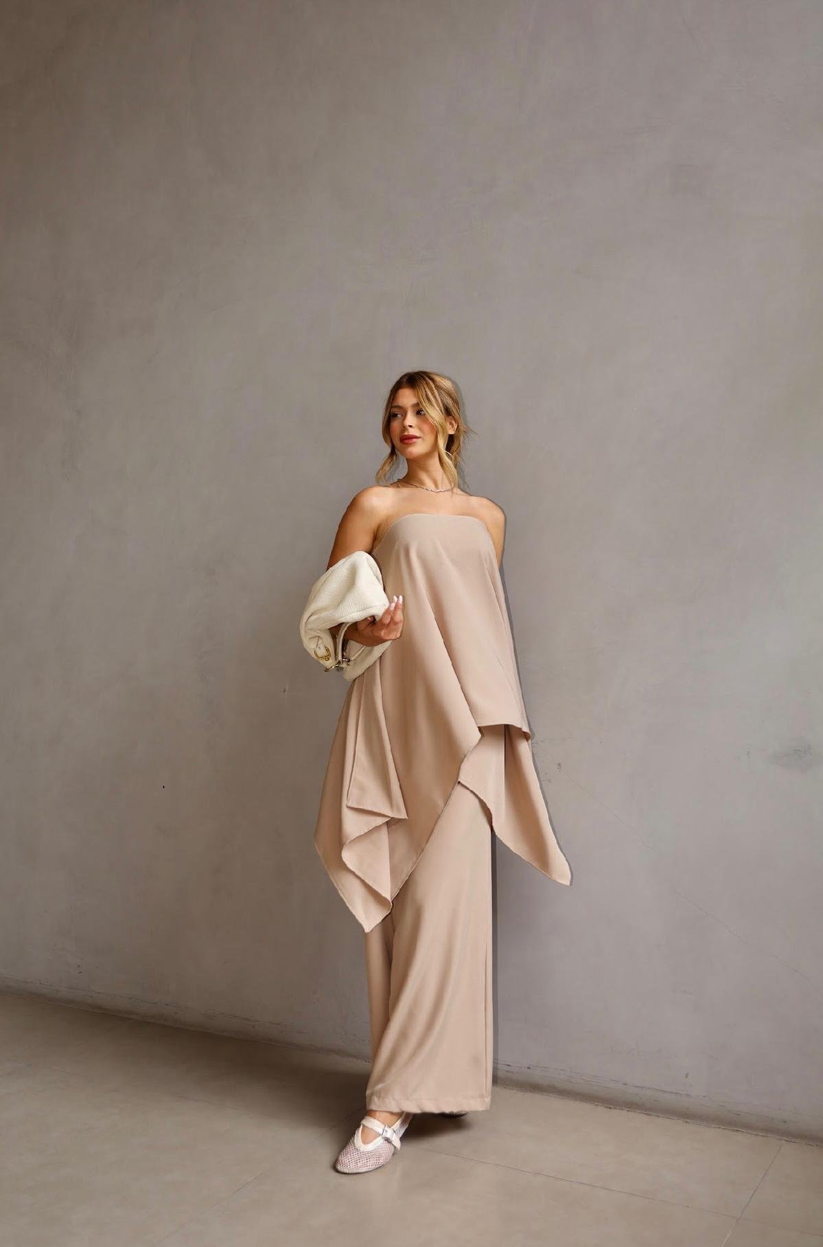 Calça com a modelagem pantalona, confeccionada no tecido plano twill, possui um caimento leve e flúido. Possui bolsos faca, forro embutido na peça e fechamento por botão de pressão niquelado.