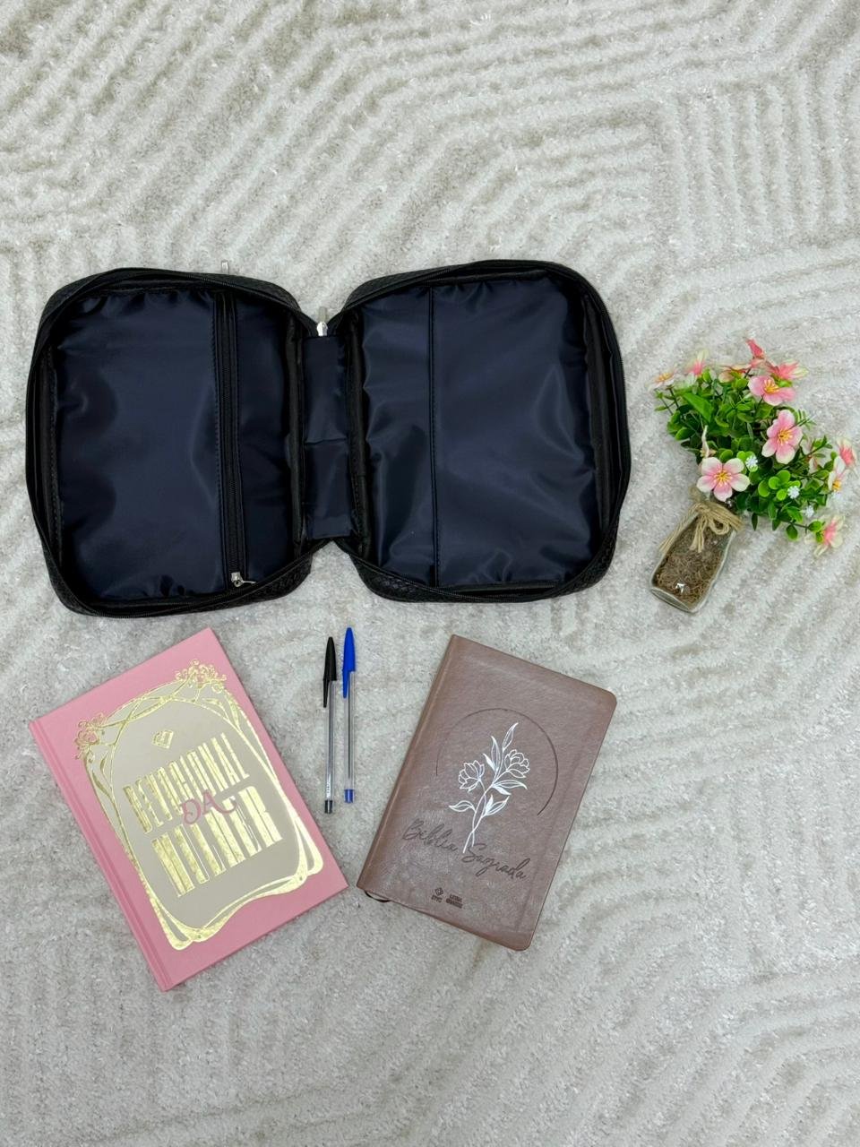 Espaço para a Bíblia, o devocional, o celular, as anotações e canetas.