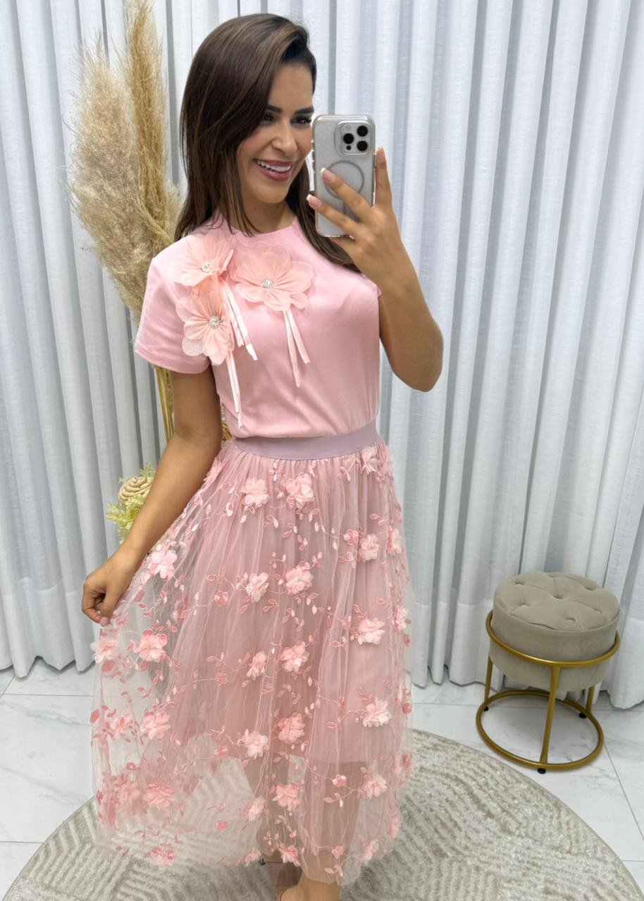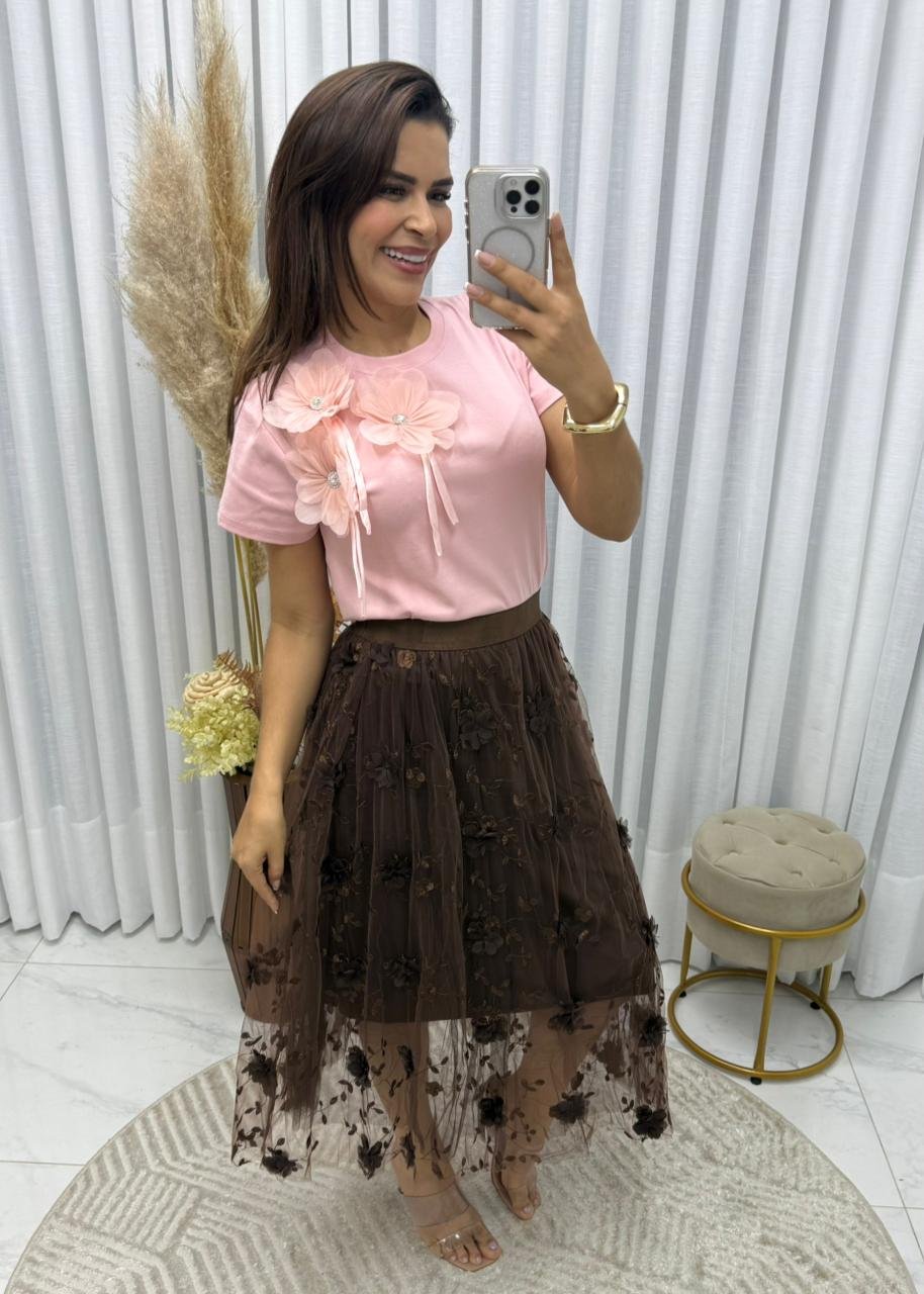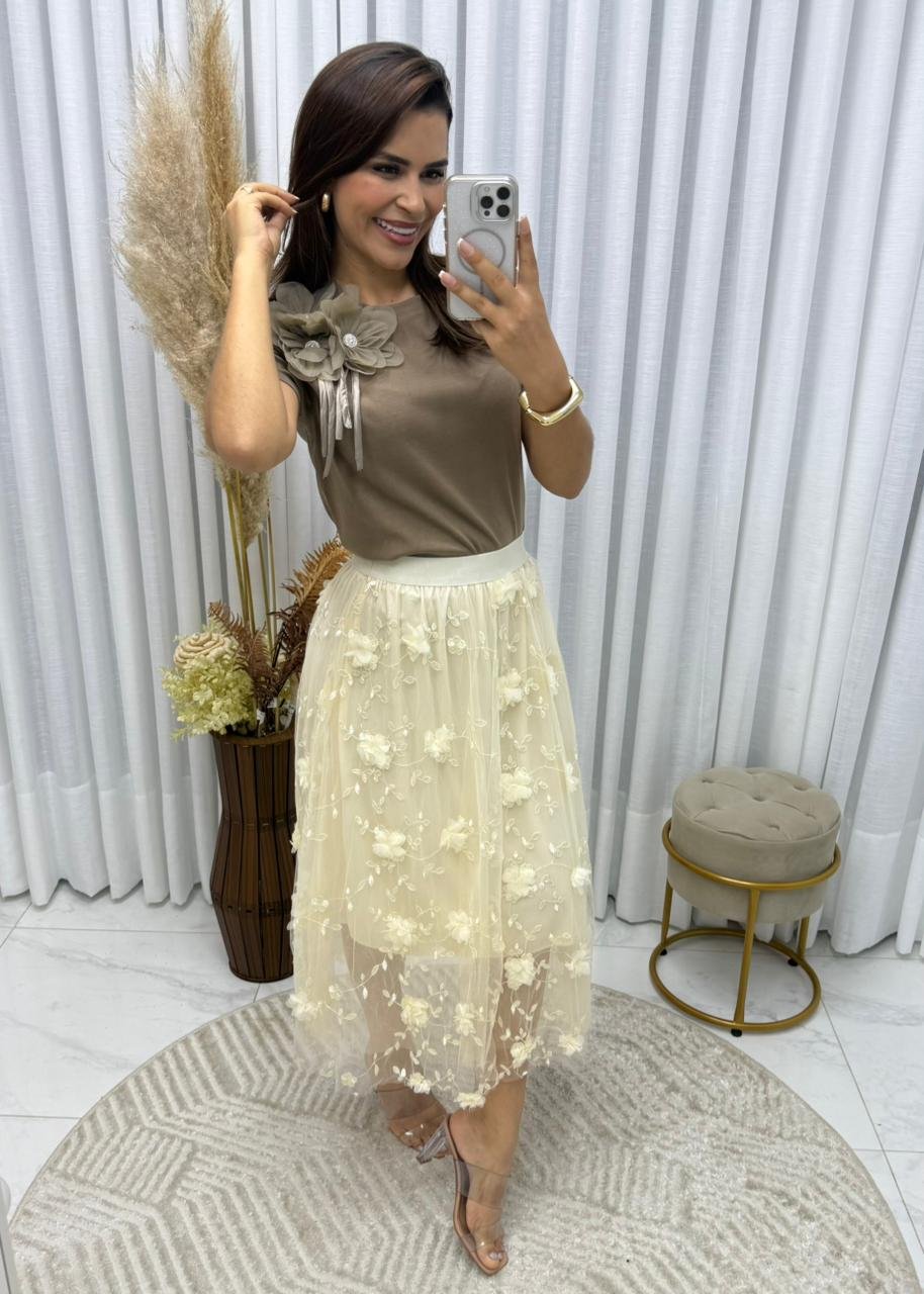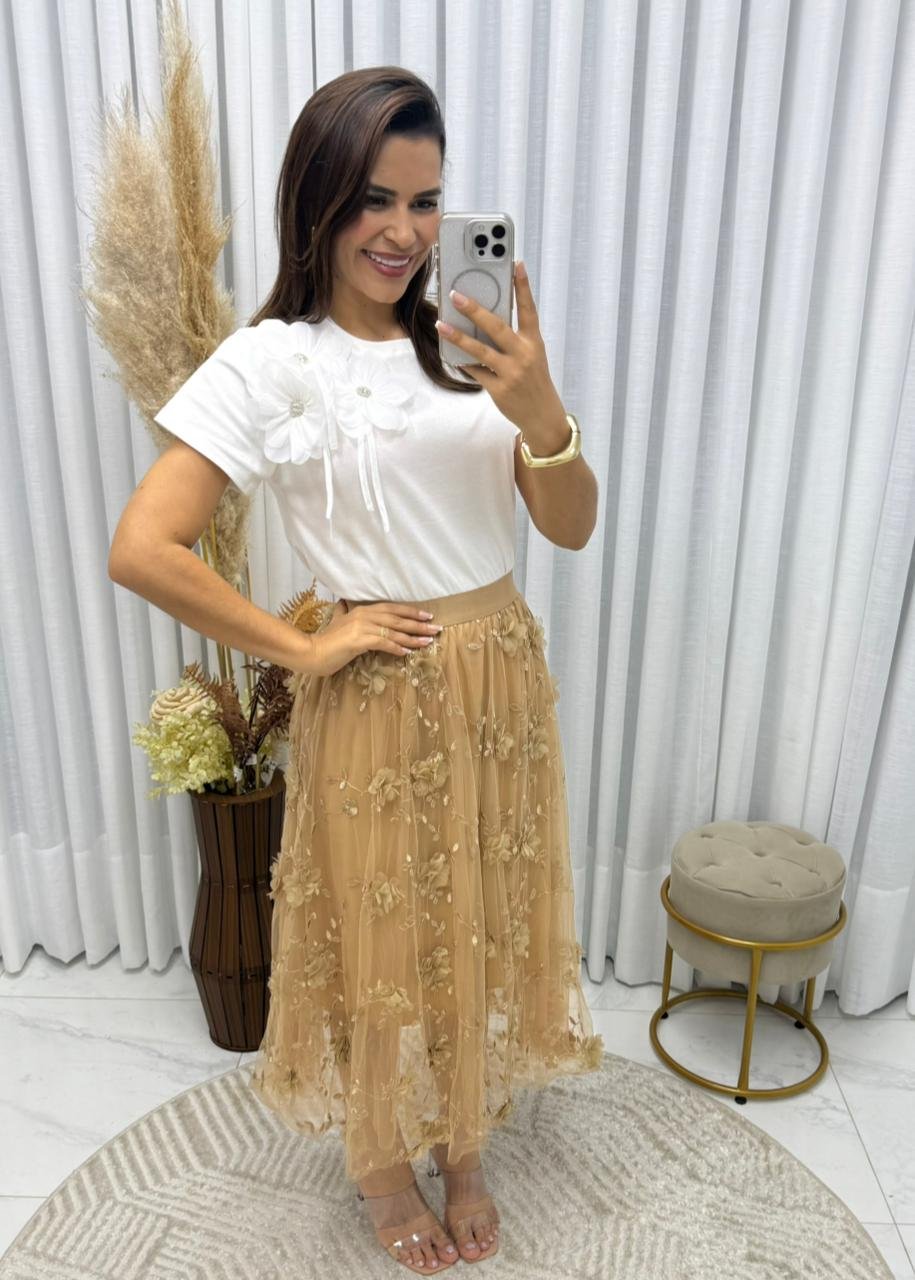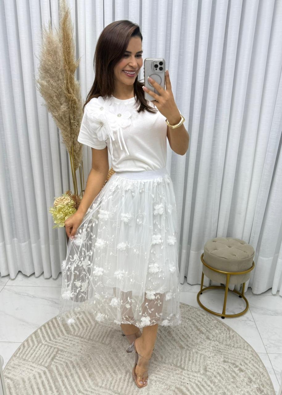 Saia de Tule com flores midi,