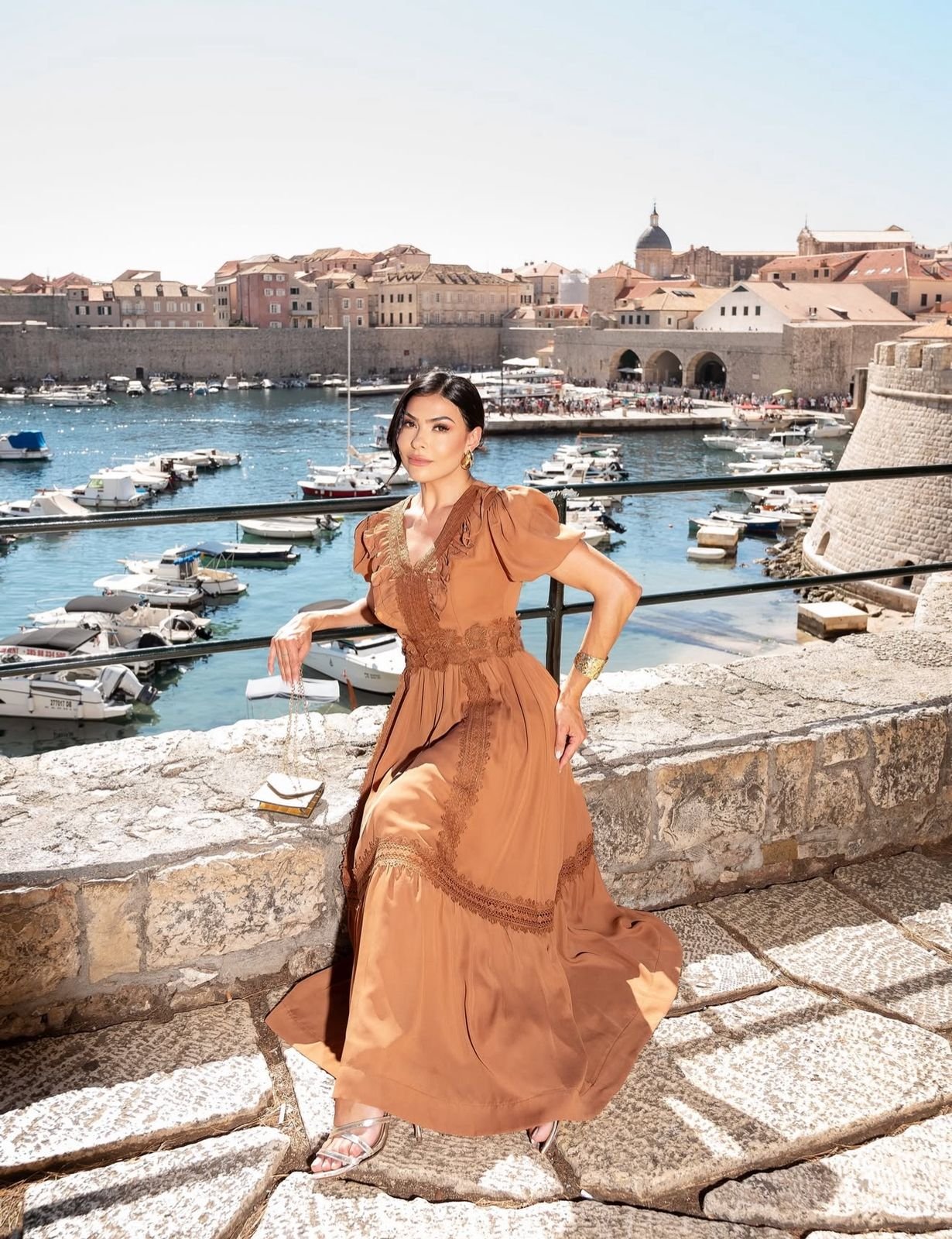 Vestido Ária, um modelo cheio de leveza e romantismo, confeccionado em tecido musseline, que garante fluidez e sofisticação. Possui decote em V com babados delicados, mangas curtas levemente  bufantes, e recortes com detalhes rendados que trazem charme ao visual. A saia tem caimento soltinho em camadas, proporcionando movimento elegante. O fechamento é por zíper nas costas, garantindo praticidade e bom ajuste.